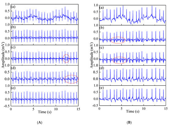 The comparison of the denoising results of different motion artifact removal methods on normal beat record 209 (A) and arrhythmia record 219 (B); (a) Noisy ECG signal; (b) DWT; (c) EMD; (d) EWT; (e) EWT-WT. The red circle indicates partial distortion of the signal.