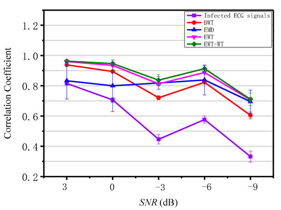 The infected ECG signals were processed by DWT, EMD, EWT and EWT-WT methods. The correlation coefficient is commonly used as a performance parameter in the study of the motion artifact removal for ECG signals [40]. The correlation coefficient between the denoised ECG signal and the original ECG signal was obtained, as shown in Figure 7. It can be seen that the average correlation coefficient of the EWT-WT method is higher than that of the DWT, EMD and EWT methods, which indicates that the EWT-WT method has better restorage for the original ECG signal.