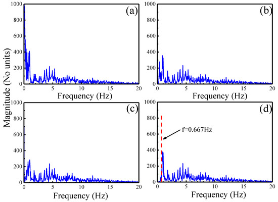 Figure 8 shows the spectrum corresponding to the real ECG signals after denoising using different methods. The spectrum of motion artifacts in the original ECG signal mainly concentrates on the first peak. The EWT-WT method can effectively remove the information of the first peak, but the denoising results using DWT and EMD still contain part of the information of the first peak. The adaptive spectrum of the EWT-WT method is shown in Figure 8d, which shows that the cutoff frequency between the noise and ECG signals is 0.667 Hz. The spectral segmentation boundary of EWT-WT adaptively varies with the different input signals.
