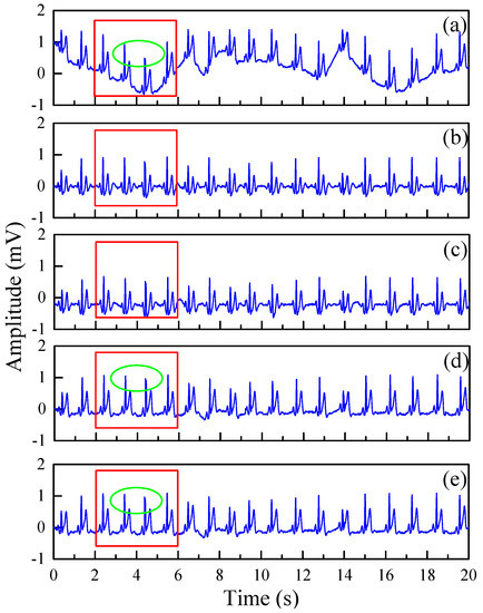 Figure 8 shows the frequency domain diagram of the denoising results using DWT, EMD, and EWT-WT methods for real ECG signals. Figure 9 shows the results of different motion artifact removal methods for real ECG signals. The red line area indicates that the proposed EWT-WT based method can efficiently remove the effects of motion artifact and maintain all the characteristic details of the ECG signals. The ECG signals denoised by the DWT and EMD based approaches show partial distortion. Comparison results of the WT and EWT-WT methods for real ECG signals are shown in a green colored circle in Figure 9d,e. In order to observe the retained useful information more intuitively, we compared the ECG details of the original signal and the denoised signal. Figure 10 presents the original ECG signals and the denoised ECG signals using various methods for a real ECG signal.