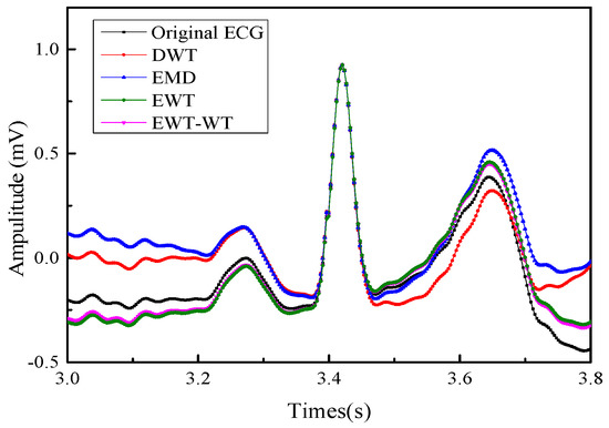 In Figure 10, it is observed that the amplitude of the Q wave of the original ECG signal is significantly lower than the amplitude of the S wave. However, the amplitude of the Q wave of the ECG signal denoised by the DWT and EMD method is slightly higher than that of S wave. This indicates ECG signals denoised by the DWT and EMD method show a significant distortion. The QRS wave is well restored in the ECG signal denoised by the EWT-WT and EWT motion artifact removal method. We can observe from Figure 10 that the denoised ECG signals by the EWT-WT and EWT method basically coincide with the original ECG signal, while the S wave and T wave of the denoised ECG signals using the DWT and EMD methods show a significant downward shift. The DWT and EMD based approaches fail to estimate the morphologies of QRS complexes of the ECG signals. The EWT-WT and EWT methods show better behavior in removing motion artifacts. The EWT-WT method has better ability to preserve the useful information for the ECG signals. The proposed EWT-WT method offers better performances than other methods recently published [8,10,29].