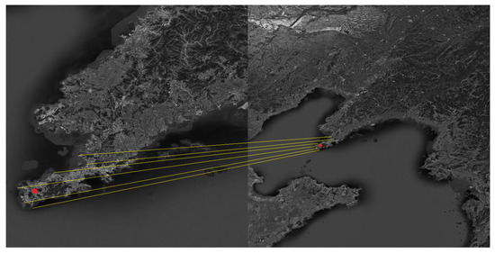 The Shandong Peninsula, the Liaodong Peninsula and the Yangtze River Delta were selected as the navigation landmarks. The landmark cameras were used to photograph the landmarks in the flight segment of the aircraft, and then the landmarks were compared to obtain the position and attitude of the aircraft. The matching process is shown in Figure 5, Figure 6 and Figure 7.