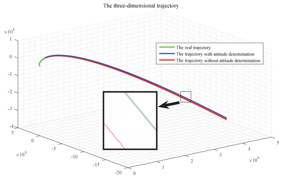 It can be seen in Figure 11 that, during the whole navigation process, the orbit determination of the aircraft with attitude determination is almost the same as the real orbit, while the trajectory without attitude determination is far from the real orbit, which indicates that the attitude determination is critical. The comparison of the position as well as the velocity determination in three directions are given, respectively.