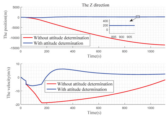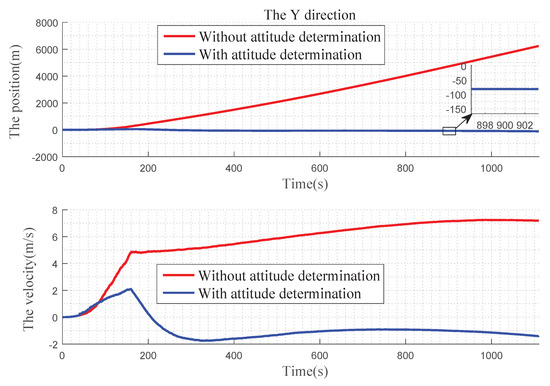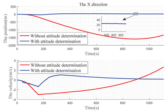 In Figure 12 , we can find that, in the X direction, when there is no attitude determination, the error of the position gradually becomes larger before 900 s, and there is a convergence trend after 900 s: the velocity error becomes larger with time. With the attitude determination, the position and velocity errors can be kept near 0. In Figure 13, for Y direction, without the attitude determination, the position and velocity errors diverge over time. With the attitude determination, the position error is very small, almost at 0 level and the speed figure has a slight error, but it also has a better improvement. In Figure 14, for Z direction, without the attitude determination, the position error diverges with time, the velocity error is divergent before 160 s, and then gradually converges after 160 s. When with the attitude determination, the changes of the position and velocity errors are similar to the Y direction.