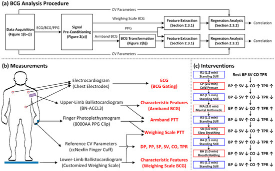 From each subject, a wide variety of physiological signal waveforms required for investigating the relationship between the upper-limb (i.e., arm) and lower-limb (i.e., leg) BCG and the CV parameters was instrumented using off-the-shelf sensors as follows. First, the ECG was instrumented using three gel electrodes in a modified Lead II configuration interfaced to a wireless amplifier (BN-EL50, Biopac Systems, Goleta, CA, USA). Second, the reference CV parameters (including the BP waveform, SV, CO, and TPR) were instrumented using a fast servo-controlled finger cuff embedded with a blood volume waveform sensor on the ring finger of a hand to implement the volume clamping method [18,19] (ccNexfin, Edwards Lifesciences, Irvine, CA, USA). Third, the upper-limb BCG (called hereafter the armband BCG) was instrumented using a high-resolution accelerometer embedded in an armband equipped with a wireless amplifier (BN-ACCL3, Biopac Systems, Goleta, CA, USA). Fourth, the lower-limb BCG (called hereafter the weighing scale BCG) was instrumented using a strain gauge embedded in a customized weighing scale (BC534, Tanita, Tokyo, Japan). Fifth, the PPG signal was instrumented using a finger clip sensor (8000AA, Nonin Medical, Plymouth, MN, USA). All the devices were interfaced to a laptop computer by way of a data acquisition unit (MP150, Biopac Systems, Goleta, CA, USA) to synchronously instrument all the waveforms at 1 kHz sampling rate (Figure 1b).