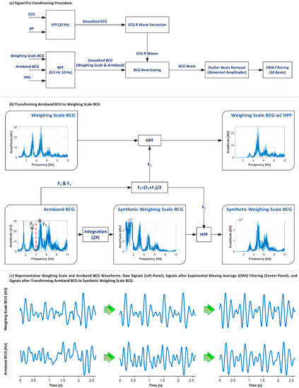 Procedure for signal pre-conditioning and transformation of armband BCG to weighing scale BCG. (a) Signal pre-conditioning procedure. LPF: low-pass filtering. BPF: band-pass filtering. EMA: exponential moving average. (b) Procedure for transforming armband BCG to weighing scale BCG. F2, F3, FC: frequencies associated with 2nd (F2) and 3rd (F3) spectral peaks and the band (marked as red vertical line in the armband BCG signal) of high-pass filtering (HPF). (c) Representative weighing scale and armband BCG waveforms: raw signals (left), signals after EMA filtering (center), and signals after transforming the armband BCG to the synthetic weighing scale BCG.