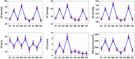 Figure 3 shows the trends of the changes in the CV parameters in response to the hemodynamic interventions employed in this work. DP, PP, SP, and TPR increased in response to CP, MA, and BH, while it decreased in response to SB. Likewise, CO increased in response to CP and MA. But, it increased modestly in response to SB and decreased modestly in response to BH. SV decreased in response to all the hemodynamic interventions. Noting that CO increased in CP and MA, the decrease in SV may be attributed to a large increase in heart rate which shortens the left ventricular ejection time yet still increases CO [45]. On the other hand, the decrease in SV in SB and BH may be associated with the marginal change in CO and decrease in heart rate, which is consistent with the findings of prior studies [46,47,48]. These trends were used in defining the extrema associated with the CV parameters in Table 2.
