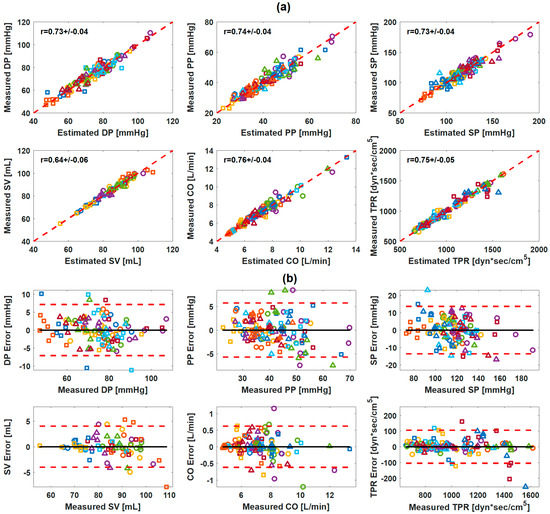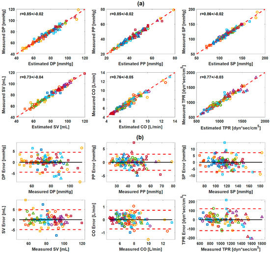 Correlation and Bland–Altman plots between measured versus regressed cardiovascular parameters: weighing scale ballistocardiogram (BCG). (a) Correlation plots. (b) Bland–Altman plots. Black solid line: bias. Red dashed lines: confidence interval.