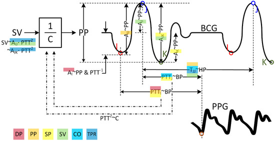 Considering that the shape of the BCG may originate from the aortic BP waveforms, it is quite reasonable to conceive that the BCG (especially the characteristic features therein) may have a close relationship to the CV parameters. Combined with the unobtrusiveness of the BCG instrumentation, such a capability may open up unprecedented possibilities for ultra-convenient estimation of CV parameters in daily life. Regardless, the existing body of work on the use of the BCG for CV parameter estimation is quite sparse other than cuff-less BP. Indeed, it is only recently that a few pioneering studies to investigate the feasibility of the BCG for CV parameter monitoring appeared, including diastolic BP (DP) and systolic BP (SP) [1,2,14,30,31,32], SV and CO [30,33], peripheral blood oxygenation [30], and preload and afterload [34].