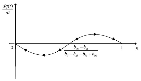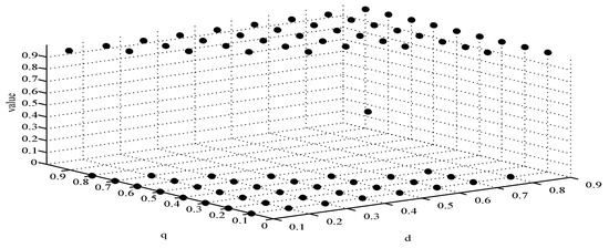 We obtain that F1 and F5 are stable points and F2 and F3 are unstable points. Since the value of equilibrium F4 is uncertain, we use the replication dynamic evolution graph to analyze it, as shown in Figure 2. According to Equation (18) and Figure 2, F4 has three stable states at most: 0, 1, and , respectively. For any user’s strategy, when the value of d is 0 and 1, the tangent slope is negative and we can define it as a stable evolution strategy. When the value is and the probability q is chosen to satisfy , the state is stable too. When , is the ESS of users. When , is the ESS of users. Similarly, when , is the ESS of publishers. When , is the ESS of publishers. Therefore, this model has an evolutionary stable equilibrium solution.