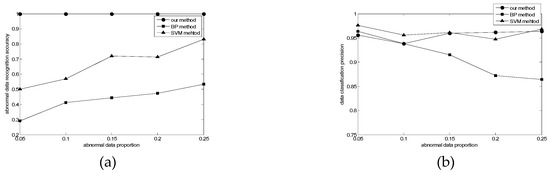 where sumjad represents the number of true abnormal data that are judged as abnormal data, sumad represents the number of abnormal data, sumjd represents the number of data that are judged correctly, sumd represents the number of data. Comparison of abnormal data recognition precision and data classification accuracy is provided in Figure 3.