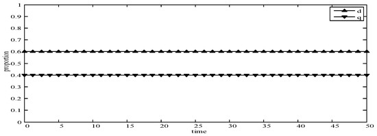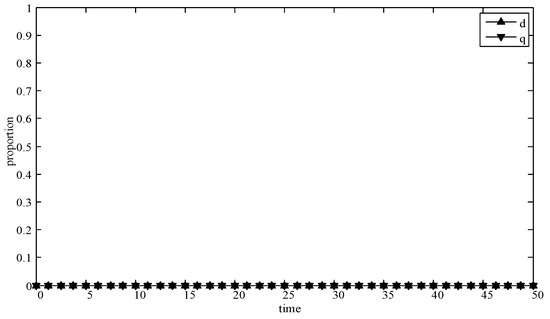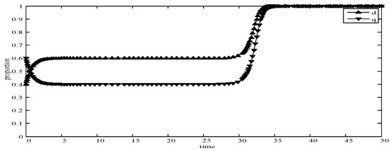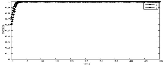 - When d = 0 and q = 0, it means that publishers all provide strategy pwh, and users all provide strategy uwh. According to the simulation, we find that strategies selection has no change with the evolution time, as shown in Figure 4. The evolution result can be one of the stable states of the system, which also verifies that the user revenue can be maximized when publishers adopt a high incentive strategy and users adopt a high data quality strategy.