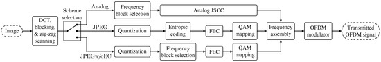 - A digital system, named JPEG without entropy coding (JPEGw/oEC), where the source encoder removes the redundant information in a similar way to that of the analog scheme, thus disregarding a fixed number of DCT coefficients. Next, the resulting data are also encoded using a channel encoder and modulated with a QAM scheme.