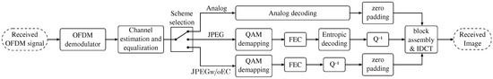 At the receiver, the channel is estimated and equalized using minimum mean squared error (MMSE) algorithms. The OFDM demodulator will hence provide a vector of received symbols after the corresponding channel equalization. These symbols are employed to compute an estimate of the DCT coefficients for each block of pixels of the image. Each of these blocks is then converted back to the spatial domain by applying the inverse discrete cosine transform (IDCT). Next, the received image is finally reconstructed from the blocks of pixels at the output of the IDCT.