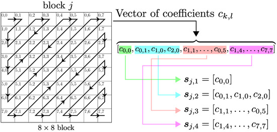 Figure 3 shows an example of this frequency division applied to the j-th block of DCT coefficients of the source image, when considering . As observed, the 64 coefficients are first sorted according to their frequency position using a zig-zag scanning pattern. Next, the ordered coefficient vector is split into different blocks: the first block () contains only the DC coefficient (), the second block () groups the three next DCT coefficients (), whereas the third () and fourth () blocks correspond to medium and high frequencies, respectively. Repeating this operation for each DCT block of the image, we will obtain sub-vectors at each step (see Figure 3). Finally, we construct vectors, each one comprising the corresponding sub-vectors obtained for all the DCT blocks of the image. Thus, the vectors of coefficients corresponding to the source image are obtained as follows