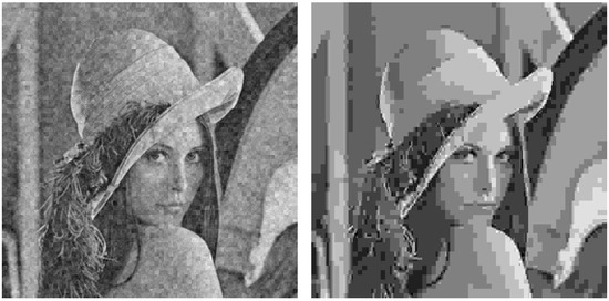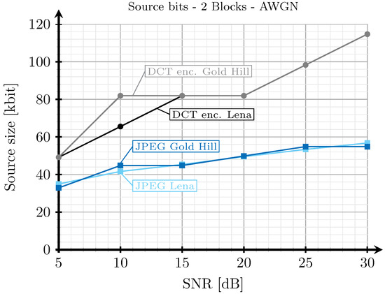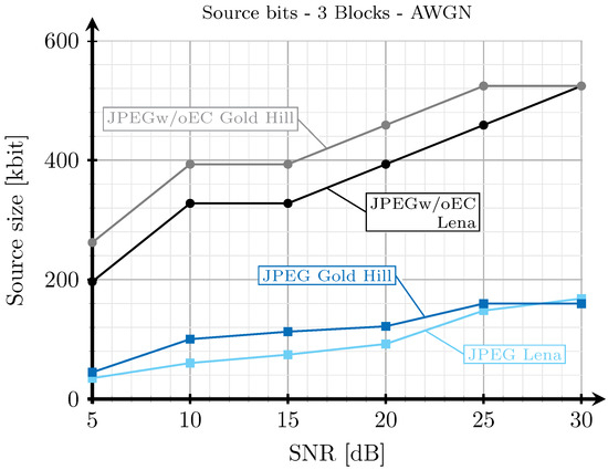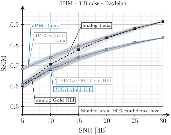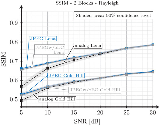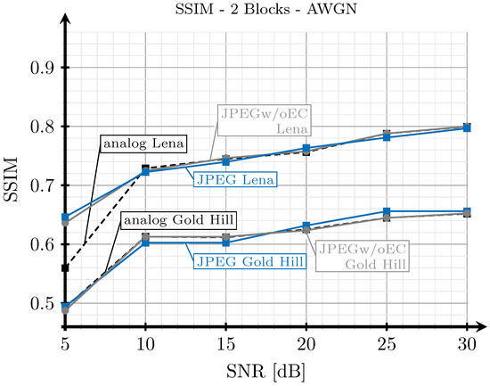 Next, for the two received analog images (corresponding to the two block and three block schemes), digital images were source-encoded in such a way that the decoded image had an SSIM index value as close as possible to that of the image transmitted with the analog system. The SSIM was adjusted in this case by changing the quality parameter of the quantization matrix as explained in Section 2.2. Note that, for the JPEGw/oEC scheme, the images were encoded by discarding the same data vectors ( and/or ) as the corresponding analog scheme, as shown in Table 3.