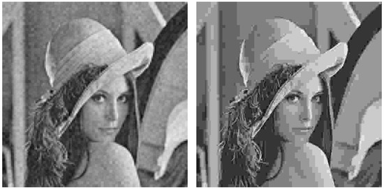 As an example, Figure 5 shows the Lena image which is first transmitted with the analog system (left hand side) and, next, encoded with JPEG to obtain an SSIM index value as close as possible to that of the analog transmission (right hand side). Figure 6 and Figure 7 extend the comparison in Figure 5 for larger SSIM index values. It can be seen that the images transmitted with the analog system (left hand side of Figure 5, Figure 6 and Figure 7) are mainly altered with AWGN noise and the main image details are preserved for the three SSIM index values considered. The images transmitted with the JPEG scheme (right hand side of Figure 5, Figure 6 and Figure 7) are altered by the JPEG quantization quality parameter, which causes the loss of some details of the image.