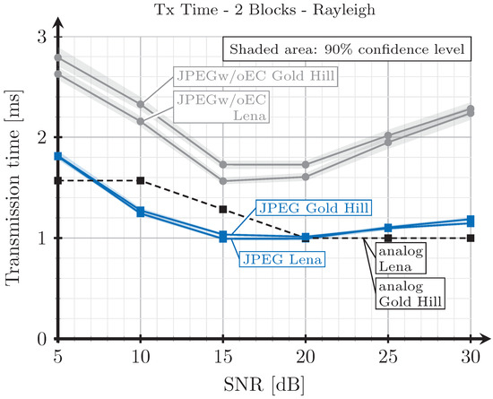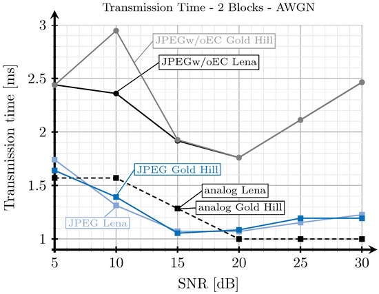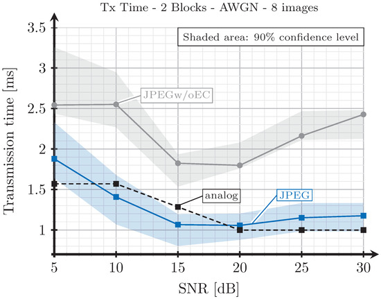 For the JPEG scheme, we can see in Figure 8, Figure 9, Figure 10 and Figure 11 that, for SNR values between 5 and 15 dB, the transmission time tends to decrease (the only exception is found in Figure 9). This effect is more noticeable when considering the two blocks analog scheme (Figure 8 and Figure 10). This is due to the reduction of the coding rate of the channel encoder as the SNR increases, while the improvement of the quality (SSIM) for the analog-encoded image is smaller in that SNR range. Thus, although the number of bits required at the output of the source encoder slightly increases for the digital schemes, the improvement of the OFDM modulation with the SNR is much higher, leading to both a reduction in the number of required channel symbols and a faster transmission. Conversely, for higher SNR values, the transmission time increases with the SNR. This effect is due to the quality improvement of the analog system in this SNR regime, increasing to a larger extent the number of bits required to encode the digital images, which cannot be compensated with the improvement of the OFDM modulation with the SNR. Additionally, the coding rate saturates at its maximum value (see Figure 12) and the amount of redundancy bits remains constant. More explanations about this behavior are provided in Section 4.3 and Section 4.4. Finally, the JPEGw/oEC scheme exhibits a similar behavior to that of the JPEG scheme, but the transmission times are worse because of the use of a simpler compression scheme.