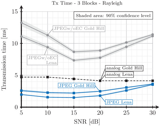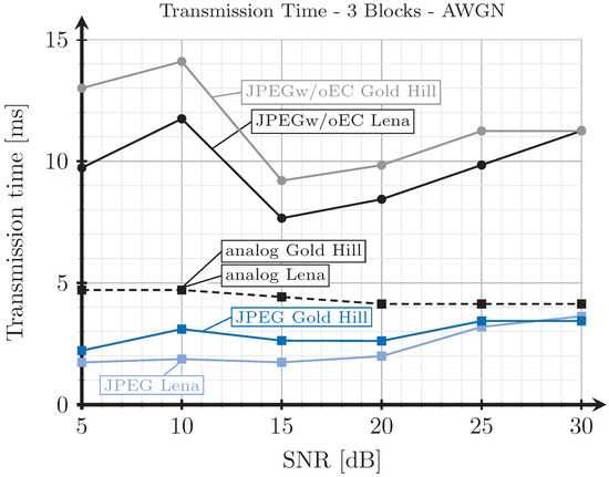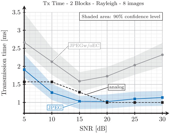 The proposed analog scheme achieves its best results, in terms of transmission time, compared to the digital schemes for the two blocks case. Figure 8 and Figure 10 show that the transmission times of the analog scheme are very similar to those of the JPEG scheme, and even better for some SNR values. On the other hand, Figure 9 and Figure 11 show that when the three blocks scheme is considered, the transmission time is worse than that of the JPEG scheme, but still much better than that of the JPEGw/oEC scheme, especially for the Rayleigh channel model (see Figure 11).