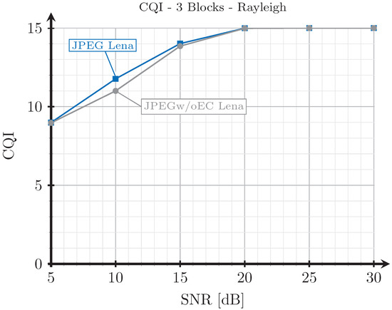 Figure 12 shows the CQI of the data transmitted with the digital schemes with respect to the SNR for the case of a Rayleigh channel. The difference between JPEG and JPEGw/oEC is because the amount of data transmitted with JPEGw/oEC is larger, hence increasing the probability of suffering an error, thus reducing the optimum CQI value for that cases. The results corresponding to the AWGN channel are very similar to those shown in Figure 12 and were not included.