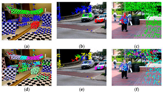 Sample results in video sequences of the KT3DMoSeg dataset with the proposed method, with the different motions labeled with points of different colors and shapes. (a) Seq005_Clip01, (b) Seq009_Clip03, (c) Seq013_Clip02, (d) Seq113_Clip01, (e) Seq005_Clip01, (f) Seq071_Clip01.