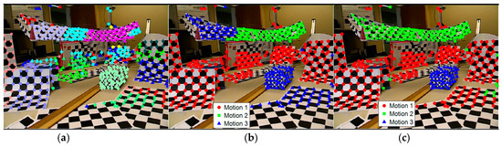 Model selection results obtained on checkerboard sequence 2RT3RCT_B. (a) Data grouping results obtained by Equation (7), which is the initial input of the model selection; (b) intermediate results of model selection during iterations; (c) final segmentation results obtained after model selection.