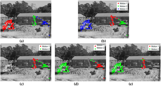 We can make the following observations from the two tables. The RANSAC, GPCA, LSA, and ALC methods have high classification error in the entire experiment. Meanwhile, the SSC method always performs well—even on the challenging sequence articulated, the classification error is only 1.42% for three motions and 0.62% for two motions. However, the proposed method performs the best among all the methods on the checkerboard and traffic sequences, obtaining the lowest classification error. The classification error has been significantly reduced, about 12 times better than the best result previously reported by SSC. On the articulated sequences, it scores second-best, and is fairly close to the SSC algorithm. However, the classification error of the proposed method is still much lower than that of the other methods. Moreover, most of the existing methods do not perform well on the articulated sequences. This is because motions in the two_cranes video sequence are very complex and partially dependent on each other (as shown in Figure 3). We can make the observation from Figure 3a that the number of tracking points is only 94, making it impossible to generate sufficient assumptions for good permutation preferences. Figure 3b is the segmentation result of three motions, whose classification error is 3.29%. Figure 3c–e gives the segmentation results of two motions, with a classification error of 5.13%, 3.9%, and 4.17%, respectively.
