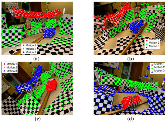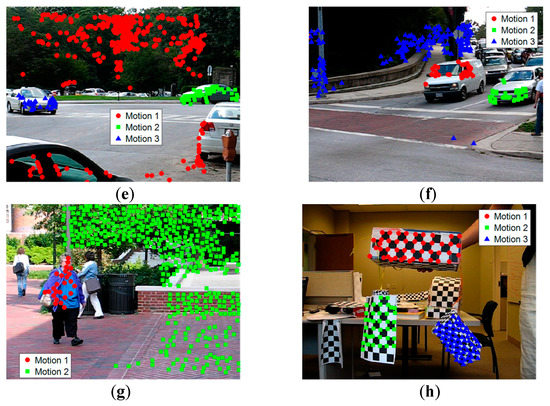 Figure 4 shows some example frames from the Hopkins 155 dataset, which is the corresponding correct segmentation obtained by our method. The proposed method can correctly classify the points belonging to different motions. Figure 4a–d gives the checkerboard video sequences, Figure 4e,f gives the traffic video sequences, and Figure 4g,h gives the articulated video sequences. It is very difficult for many methods to correctly segment motion models that are close in the spatial domain because they involve the spatial constraints of data points, such as in sampling and clustering. On the contrary, since we group the data points based on similarities in the feature space, instead of grouping the data points with Euclidean distance directly in the Euclidean space, the spatial constraint is not so important for motion model grouping. Therefore, our method can well segment motion models that are spatially close.