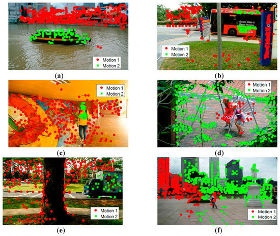 Sample results in video sequences of the MTPV62 dataset with the proposed method, with the different motions labeled with points of different colors and shapes. (a) Boat, (b) Bus, (c) Girl, (d) Swing, (e) Van, (f) Raffles.