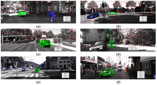 We make the following observations from Table 3. First, we achieved a pretty good performance on Hopkins 50 clips. However, the average classification error on the Missing Data 12 clips is a little high. As seen in Figure 5f, incorrect segmentation on the Raffles sequence results in the high classification error of MTPV62 dataset. Actually, the classification error on the Raffles sequence is as high as 31.33%. The reason is that the distribution of the inliers of the foreground and background is extremely unbalanced, and the background is very complicated. In addition, there are only seven points belonging to the foreground, which results in difficulty in sampling an all-inlier minimal set and seriously impacts the performance of the preferences. Secondly, we obtained the best average classification error on the KT3DMoSeg dataset. However, the segmentation accuracy can be further increased when considering the complexity of KT3DMoSeg. Many background objects in Figure 6 have noncompact shapes, thus the background is often separated and the segmentation on the junction of the foreground and background is very difficult. The most obvious case is Figure 6d. In addition, we adopt a single geometric model in handling the motion segmentation problem. However, the comparison in [58] shows that the performance of multi-view approaches is consistently better than when we adopt a single geometric model. Sometimes subspace overlap occurs with a single geometric model. Just as presented in Figure 6e,f, some foreground objects are incorrectly segmented into the background.