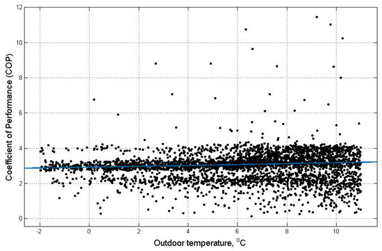 The equation obtained for the COP versus outdoor temperature curve is shown in Equation (11):
