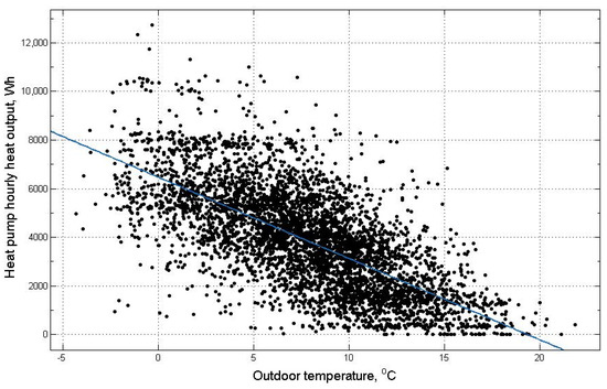 where represents heat pump hourly heat output and represents outdoor temperature. The values for the coefficients are: p1 = −334.7, p2 = 6471.