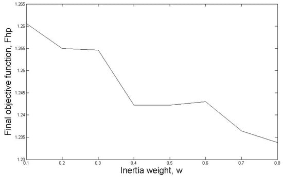 In standard PSO, the effect of varying the value of the inertia weight, w, is investigated for five cold winter days in 2019. The details of the results for 3-2-2019 is shown. The relationship between inertia weight, w, and the final objective function, Fhp, is shown in Figure 5.