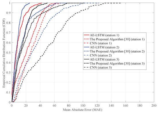 Figure 6 and Figure 7 show the MAR cumulative distribution functions for each prediction method under different conditions. In other words, it presents the probability statistics of MAR for each prediction method. Figure 6 shows the MAE cumulative distribution of traffic flow prediction. The solid line represents the prediction error of AE-LSTM algorithm, the dotted line represents the prediction error of the algorithm proposed in [17], and the shorter dotted line represents the prediction error of CNN. For the AE-LSTM prediction model, the probability of MAE less than 25 was 90% at three different stations. The errors of AE-LSTM prediction model on different datasets were basically the same, which indicates that the prediction model has good robustness. For the algorithm proposed in [17] and CNN, the cumulative distribution of MAE at different stations varied greatly, which indicates that the performance of these methods are not stable for different datasets. For the algorithm proposed in [17], the probability of MAE less than 25 was 60%. For CNN, the probability of MAE being less than 25 was 30% at Stations 1 and 2, and 30% at Station 3. Overall, the prediction accuracy of CNN was not as high as that of the other two methods at the three stations. The prediction accuracy of AE-LSTM was higher than that of the algorithm proposed in [17] and CNN. The prediction error of the AE-LSTM and the prediction error of the algorithm proposed in [17] were different at Stations 1 and 2. At Station 3, AE-LSTM and the algorithm proposed in [17] had an almost equal probability of MAE less than 10. However, the probability of MAE less than 30 for the AE-LSTM prediction model was 95%, and the probability of MAE less than 25 for the algorithm proposed in [17] was less than 80%. Therefore, the prediction accuracy of AE-LSTM was higher than that of the algorithm proposed in [17].