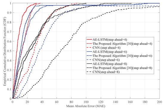 Figure 7 shows the cumulative distribution of MAE at different step ahead. We predicted the traffic flow at Steps 4, 6, and 8, respectively. As shown in Figure 7, the error distribution trend of the two prediction algorithms was similar for different prediction steps ahead. As the step ahead increased, the errors of the three prediction methods increased. The reason for this phenomenon is that the circular neural network needs to use the data generated in the previous cycle in the prediction process. The larger is the step ahead, the lower is the accuracy of the data in the previous moment. As a result, the errors of the previous prediction are accumulated and MAE becomes bigger. When the step ahead is small, the prediction accuracy is high. That is because the data used in the prediction are mostly observed values. In addition, the performance of AE-LSTM model was obviously better when the prediction step ahead was 4 and 6. However, when the prediction step ahead was 8, the prediction accuracy of the three methods was not high because the prediction step ahead was too big.