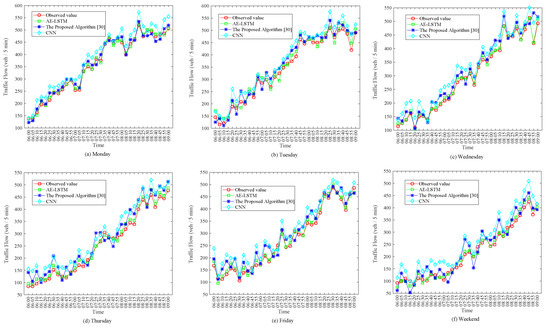 Since the morning rush hour is from 6:00 to 9:00, the traffic flow may change greatly during this period, and traffic congestion and other problems often occur. To have more positive effects on traffic control, we analyzed the traffic flow data and forecast performance during this period. Figure 9 shows the observation values and forecast values of the traffic flow for six consecutive days between 6:00 and 9:00. As shown in Figure 9, the trend of daily traffic is similar. The traffic flow is 100 at 6:00, and the traffic flow fluctuation is 500 at 9:00. During this period, traffic flow fluctuates slightly, but the overall trend is increasing. We can see that the traffic flow on the weekend is less than that on the weekday. At 9:00 on the weekend, the traffic flow is about 400. In general, the predicted values of the AE-LSTM algorithm could better match the observed values and it had better prediction performance. AE-LSTM fully considers the influence of upstream and downstream traffic flow on the current position, thus the result is more stable and accurate.