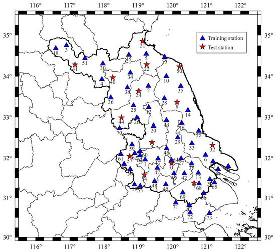 The training and test datasets are collected from CORS of Jiangsu Province (JSCORS), China, which include 1-day observations of 74 stations in DOY 324, 2010 (interval 30 s). The distribution of stations shown in Figure 3. 60 stations represented by the blue triangle (called training stations) are used for ionosphere modeling and SVM training. Distributing evenly throughout the region, 14 stations represented by the red star (called test stations), which do not participate in modeling and training, are used to test the accuracies of the models. Two stations numbered 32 and 50 (BTRD and GTBH), a part of test stations, are used for single-frequency PPP positioning experiments.