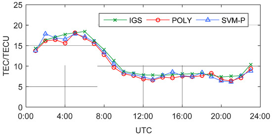 In Figure 4, the trends of the three series are coincident, indicating that there is no significant deviation among the POLY model, the SVM-P model, and the IGS product. Affected by solar radiation, the maximum of TEC in a day is about 19 TECU from 4:00 to 6:00 UTC (12:00 to 14:00 LT), and ionosphere is relative calm during the night, basically around 8 TECU. Besides, the POLY model and the SVM-P model use regional observations, which can represent small-scale changes in TEC more prominently.