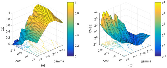 Figure 5a shows the relationship between CC and the kernel parameters and , and the impact of kernel parameters on the SVM performance is very significant. When one of the parameters is fixed, the CC will increase first and then decrease with the change of the other parameter. Finally, the optimal parameters converge in a peak space in yellow in the grid. The RMSE in Figure 5b shows an opposite trend with CC, as a valley space, but the range of optimal parameters is roughly the same. The combination of parameters in the optimal space can satisfy the accuracy requirements of CC and RMSE at the same time. In addition, the gradient of CC and RMSE is small in the optimal space, which indicates that SVM is not sensitive to the combination. Therefore, the optimal combination of parameters is (26, 2−14).