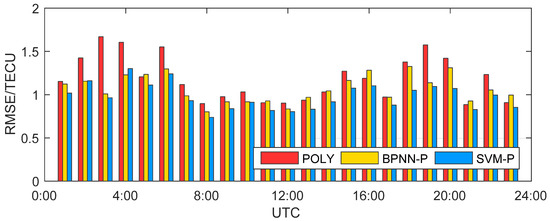 The RMSEs of the models are shown in Figure 8, and the statistical results are shown in Table 2. Because the ionospheric activity is different at each moment and the model is greatly affected by the distribution of visible satellites and IPPs, the accuracies of the models are not uniform within one day, but all RMSEs are better than 1.7 TECU. Compared with POLY, the SVM-P model can improve the accuracy of the model. With the low accuracy of the POLY (RMSE is more than 1 TECU), the improvement effect is obvious, and the maximum can up to 42.3%. When the POLY has reached a high accuracy, the SVM-P can also increase slightly at least 6.1%. BPNN-P has roughly the same effect with SVM-P, but the accuracy is not as high as it. Even at some moments, BPNN-P is worse than POLY, such as 5:00 and 11:00. The mean RMSEs of POLY, BPNN-P, and SVM-P in one day are 1.185 TECU, 1.070 TECU, and 0.980 TECU, respectively from Table 2. It means the SVM-P can effectively reduce ionospheric modeling errors, and the improvement is 17.3% compared to POLY.