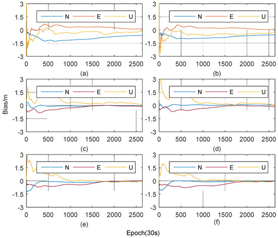 In each of four PPP experiments with ionosphere models in Figure 9b–f, the convergence rate in North direction is fastest, and it needs a period of time in East direction. And in Up direction, the trends of errors with two models are not consistent because of the effect of the ionospheric delay. When using the POLY model, due to the insufficient accuracy of ionospheric delay correction, the positioning errors in the Up direction fluctuated greatly, especially around the 1800 epoch. While, when using the SVM-P model, the errors in Up direction can remain stable after convergence. It can be seen from Table 3 that the RMSs of the two stations in the horizontal component are basically the same, but the difference of the RMSs in vertical component (Up direction) is quite obvious. This shows that two ionosphere model mainly affect the Up direction of the positioning. Since the RMSEs of the SVM-P model are lower than that of POLY and those are relatively stable in one day, the positioning accuracies of single-frequency PPP with the SVM-P are 0.141 m and 0.135 m, which increased by 47.6% and 40.2% than those using the POLY. Therefore, the PPP experiments prove that the SVM-P model can effectively improve the accuracy of ionospheric delay correction, thus improving the accuracy of single-frequency PPP positioning.