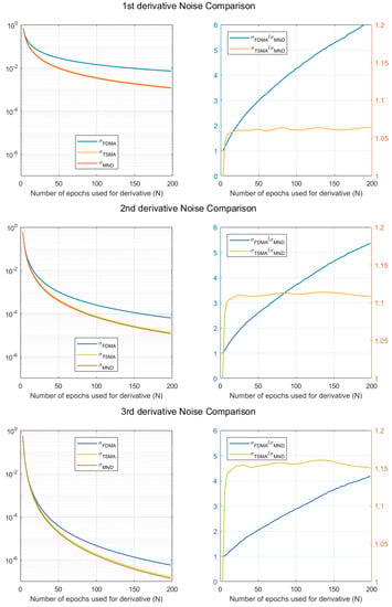 Figure 1 shows the relative noise level comparison of FDMA, TSMA, and MND, according to the number of epochs for the time derivative, . Here,  is assumed to be 1.