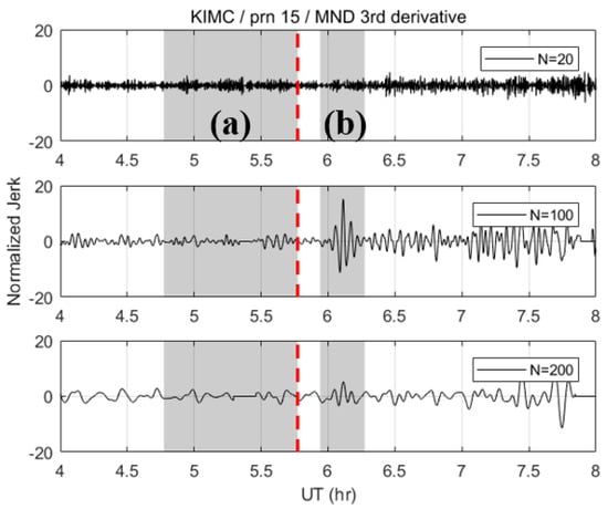 The necessity of determining the best N can be demonstrated well by Figure 2, which shows the results of the MND with different values of . The third-order derivative of the ionospheric combination was selected as the monitoring value to effectively remove the nominal trend in the data. Each dataset was normalized by the STD of shaded area (a), which corresponds to the 1-hr time span before the earthquake. The red vertical dashed line is the time of the earthquake occurrence. The shaded area (b) is the time span in which the CID is expected to arrive. This corresponds to ~10–30 min after the earthquake onset for the dataset that we used. The arrival time of the CID associated with the earthquake varies according to the distance between the epicenter and the point in the ionosphere through which the satellite signal passes. This point is called the ionospheric pierce point (IPP). As illustrated in Figure 2,  has a critical effect on the SNR and CID detection. To be more specific, when  and , the signatures of the CID hardly stand out from the noise. On the other hand, when , the CID’s peaks are dominant in the time series. Finding the best , therefore, is crucial to enhancing the detection performance of the CID.