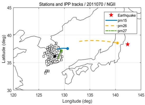 Due to the irregularity of the shape and duration of the CID, real data were used to estimate the best . Data from the 2011 Tohoku earthquake, collected from National Geographic Information Institute (NGII) stations in Korea, were chosen. There were a total of 45 stations, and three GPS satellites were chosen for the proximity of their IPP tracks to the epicenter, as shown in Figure 3.