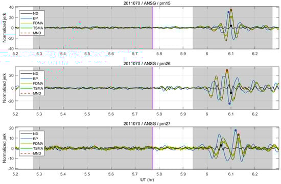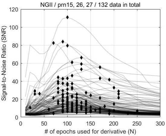 Figure 10 shows the filtering outputs of two conventional and three proposed algorithms. The “ND” indicates the conventional numerical third-order derivative with a 30-second interval [,]. In addition, “BP” stands for the band-pass filter with a 3–20 mHz passband, which gives a seemingly optimal SNR for this dataset. To assess the performance with a different PRN, the average of the SNR values at 45 reference stations is used, using the best N values from Table 2.