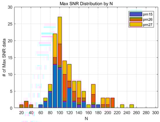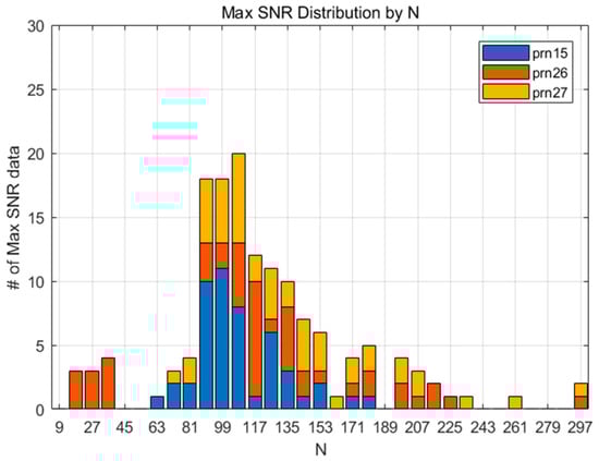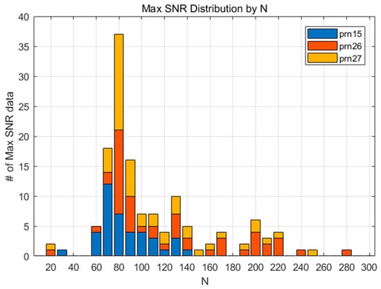 Figure 4 shows the SNR for 132 datasets according to , and the pairs of the maximum SNR and corresponding  for each dataset are marked with a diamond. It can be inferred from the figure that the SNR variation of each measurement shows diverse shapes, even for the 2011 Tohoku Earthquake case alone. This means that a small number of CID samples cannot represent the overall characteristics of the phenomenon, which is the reason for why we adopted a statistical approach for finding the best N. As shown in Figure 5, the maximum SNRs are distributed around . This means that the CID can be most successfully detected when . Likewise, the maximum SNR for FDMA and TSMA are shown in Figure 6 and Figure 7. Based on these observations, the best  values for the MND, FDMA, and TSMA are determined, as in Table 2. The third-order derivative by FDMA has its best  at 80, while the TSMA has its best  at 108. The TSMA’s interval of  was set to be 9 instead of 10, because the TSMA algorithm requires a multiple of 3 for .