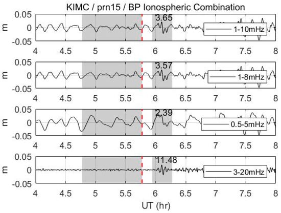 Band-passed ionospheric combination by different passbands (KIMC, prn15). Values in the right shade indicate the SNR. Refer to Figure 2 for notation.