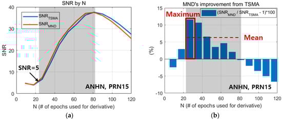 SNR comparison of the MND and the TSMA within the small-N region (shaded area) for the early detection case (ANHN station, PRN15). (a) SNR of the MND and the TSMA, (b) SNR improvement of the MND against the TSMA.