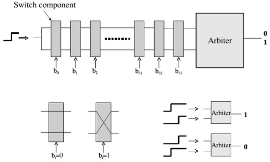 PUF relies on physical microstructure that occurs naturally during chip manufacturing [34]. The physical microstructure depends on random physical factors that are unpredictable and uncontrollable. Therefore, it is impossible to produce two chips that are exactly same, which indicates that PUF techniques have good resistance against the clone attack [35]. One of the most classic PUF architecture is arbiter PUF [36]. As demonstrated in Figure 2, the arbiter PUF circuit consists a signal transmission delay circuit and an arbiter. The circuit has 64 switches. Each switch has one control signal terminal, two input terminals, and two output terminals. When the input signal (b0 to b63) arrives, the circuit will generate two transmission delay path with equal length. The input signal is then sent to the two paths at the same time. The arbiter will finally make a decision based on its two inputs.