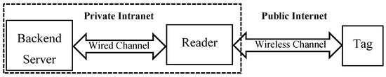 Third, there is a secure channel, inaccessible by the adversary, between the reader and the backend server. As illustrated in Figure 3, in a typical RFID system, the communications between the reader and the tag are using a public wireless channel, and are thus considered to be insecure. On the contrary, the reader is connected the backend server through a wired connection. Not only that, the communications between the backend server and the reader are generally on a private intranet, which are considered to be secure [49]. Therefore, our proposed protocols just need to focus on the insecure communications between the reader and the tag.